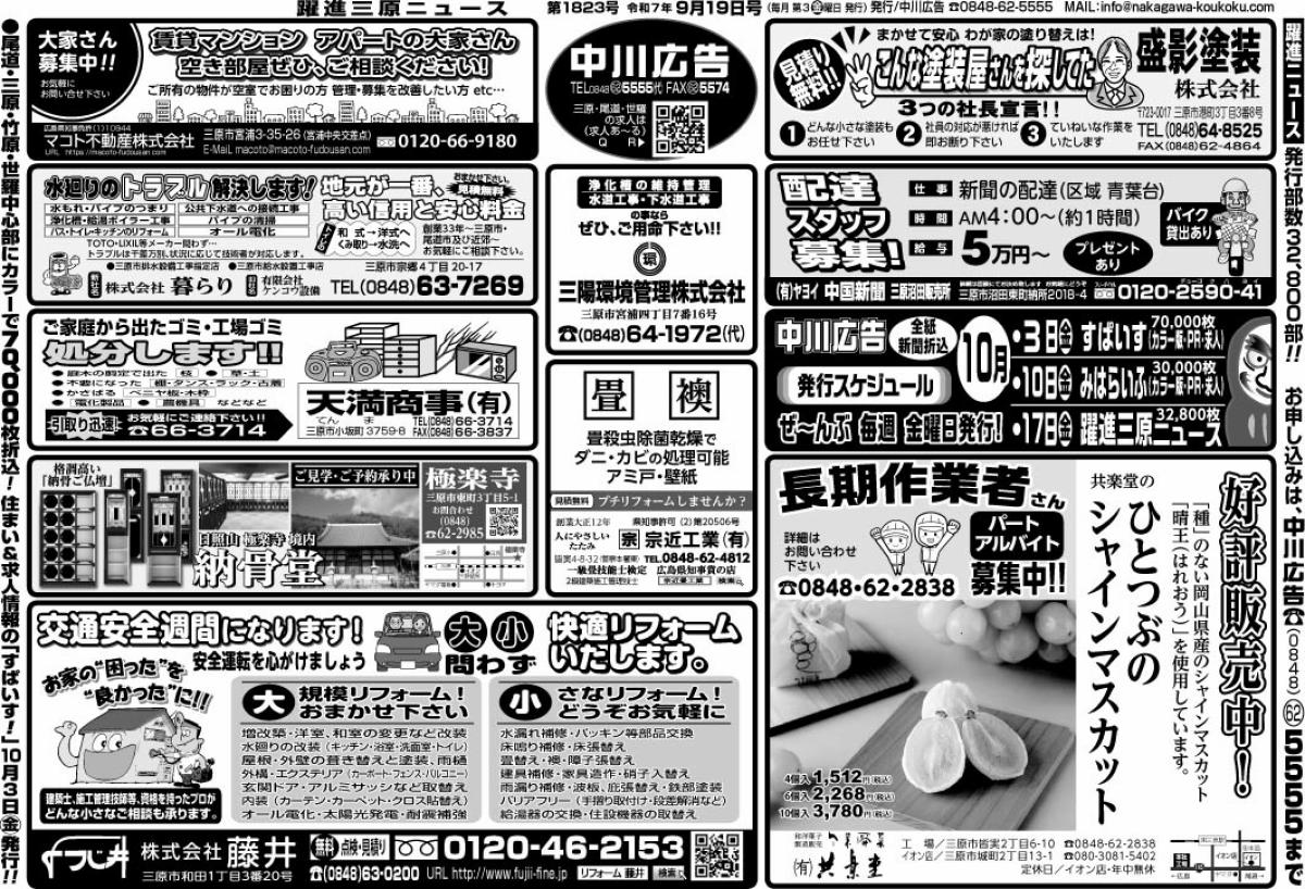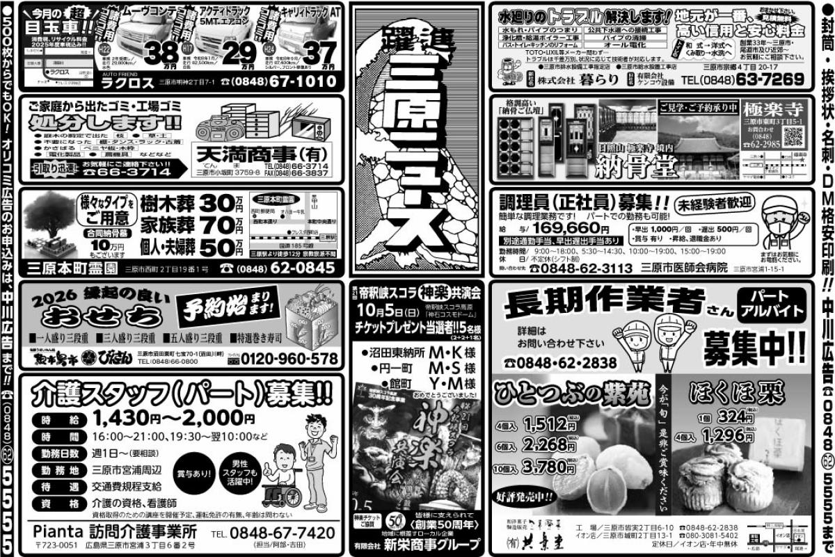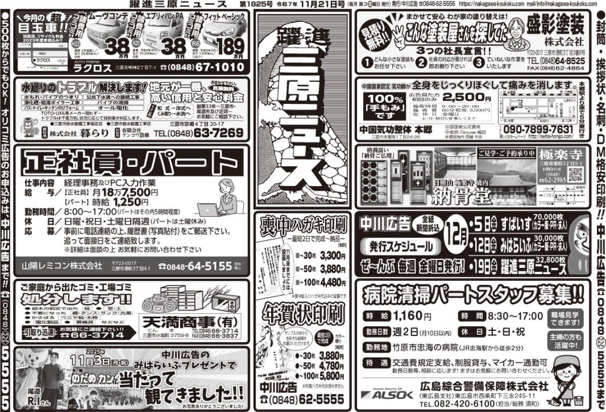 三原市全域、竹原市中心部及び忠海、尾道市美ノ郷町、世羅町中心部に32,800部新聞折込みしており、このHPにも掲載いたします。 ※求人広告のみ、HP内「求人情報」に発行より1ヶ月間掲載いたします。